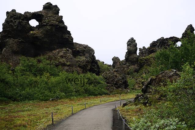 第四站:黑暗城堡(Dimmuborgir),免门票。位于在米湖东面的山坡下,从哈法尔火山脚出发,大约15分钟就到达了黑暗城堡的免费停车场。这是米湖景区最具特色,也最令人震撼的一个景点。一簇簇黝黑的奇形怪状的火山熔岩石和熔岩洞穴群集在一个狭长的山谷中,仿佛一座经历过劫难的城堡遗址。穿行在这个神秘的“城堡”中,你不得不敬服大自然的鬼斧神工。