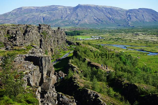 这里是冰岛作为一个岛屿的发源地。2000多万年前,欧亚大陆板块与美洲大陆板块在北大西洋深处裂开,从裂缝中喷射出滚烫的岩浆,冷凝成这个岛屿。欧亚板块和美洲板块断裂处就辛格韦德利平原上,两大板块交界处的落差有十多米。因欧亚板块与美洲板块分离而产生的大裂谷,至今仍然以每年2厘米的速度被撕裂着。