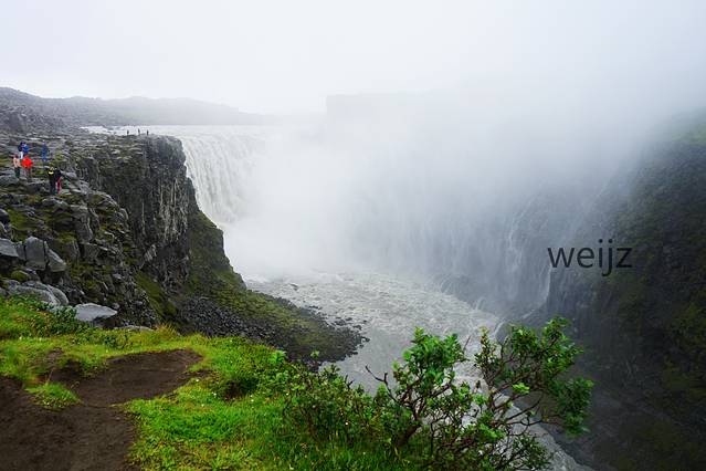 步行200米,到达停车场,眼前依然大雾茫茫,却能听到巨大的流水声。追踪着流水声前行,约10分钟后,到达观瀑点,大雾忽然散去,电影《普罗米修斯》中的那幅曾经震撼我心的画面终于呈现在眼前:黑褐色的大瀑布从天边滚滚涌来,波涛轰然呼啸,气势磅礴地直泻深渊,再沿着熔岩构造的河道奔滕远去。