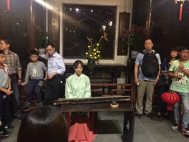 一进去的第一个表演是古筝,还没到表演时间,大家都在等,有个很朴素朴实的小姐姐来表演,就是衣服穿的红配绿,哈哈。