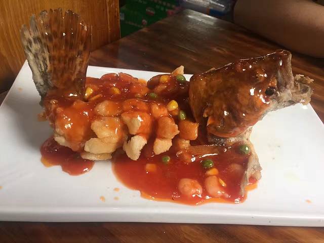 点了个松鼠鳜鱼,没有想象中那么好吃,不过没什么刺,酸酸甜甜的,