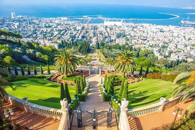 花园中心是巴孛陵寝,金色半球形穹顶位于40米高的乳白色圣殿之上,在阳光下熠熠生辉,宛如一颗璀璨的明珠。对称齐整的巴哈伊花园洋溢着浓郁的波斯风情。一条由白色大理石砌成的阶梯位于花园的中轴线上,宛如一条玉带穿梭在花园层层叠叠的绿毯之中,而沿线树木、水池、花盆、雕塑等景观则对称地分布在两侧。