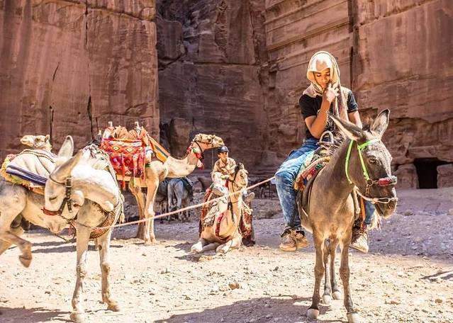 但比起骑马,驴或骆驼不如徒步来得更为直观仔细。这座古老的城池几乎是全在岩石上雕凿而成,这些岩石带有珊瑚宝石般的微红色调,在阳光照射下熠熠发亮,特殊的地貌使它呈现出绝美的颜色,所以佩特拉古城又被称为“玫瑰古城”。第一眼见到它的时候,瞬间被惊艳到了。