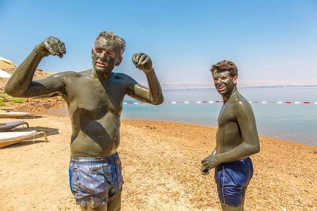 在漂浮之前,记得全身涂满死海泥哦,虽然不知道是不是真有美白补水控油收缩毛孔之功效,但这样做的最大原因就是开心。遇到一对来自澳大利亚的父子,真的是全身涂满了泥巴,成为死海沙滩上十分醒目的一道风景。父子俩还很热情的向我推荐约旦的佩特拉古城,尤其是提到佩特拉之夜。