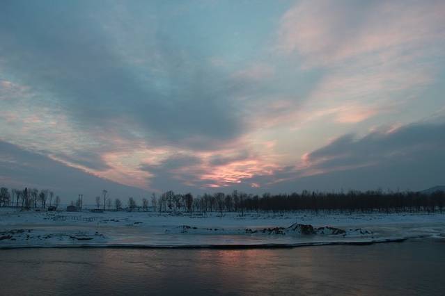 从雪谷去雾凇岛,在雾凇岛住了一晚。第二天很早就起床了,想看雾凇,可惜没有看到。不过没关系,看到了日出,头一天还看到了日落,都拍了下来。