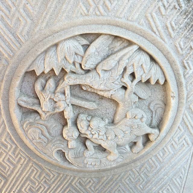 倒挂着的蝙蝠,嘴里衔了一串玉如意,藤上结了两只大冬瓜,边上还有一只螃蟹。意为“福如东海”。“海”字取的是当地方言螃蟹的谐音“庞海”。