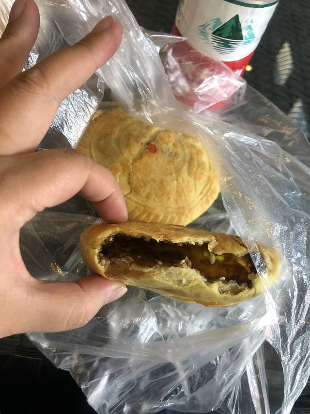 原本以为是烧饼,结果是月饼。跟常吃的月饼不一样,中间是红糖馅,很少,几乎都贴在壳上,不过还是很酥脆的。2元/个。