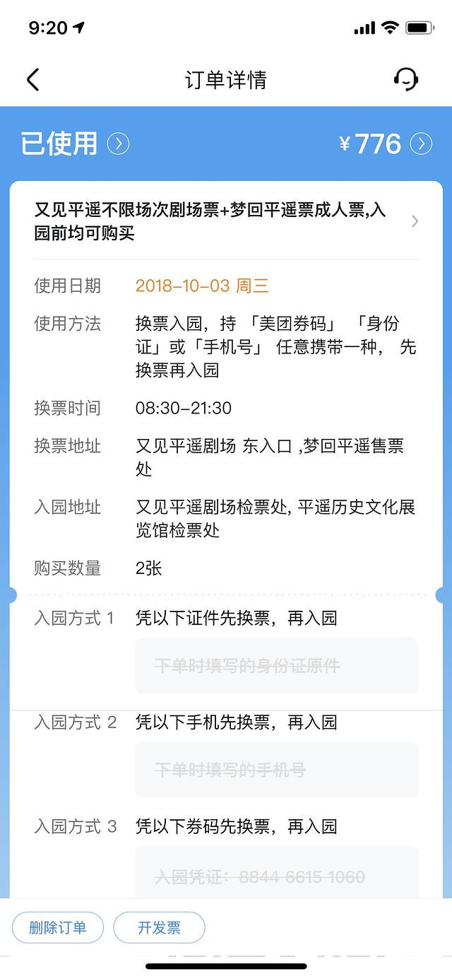 我家老公是处女座,严重纠结,一直都定不下来看几点的又见平遥,结果等我买票的时候,全部涨价了,最便宜的就是这种合订票。不过网上传说,现场买单独的又见平遥都得400了,那我也只能忍了。388*2=776元。