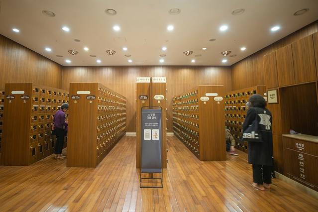 韩国的韩蒸馆,自有一套成熟的体系,鞋子从一进馆的那一刻就要脱掉了,放鞋的柜子要对应手牌的号码,同时存衣柜的号码也要对应手牌的号码。鞋柜的空间,一排排的,很整齐。