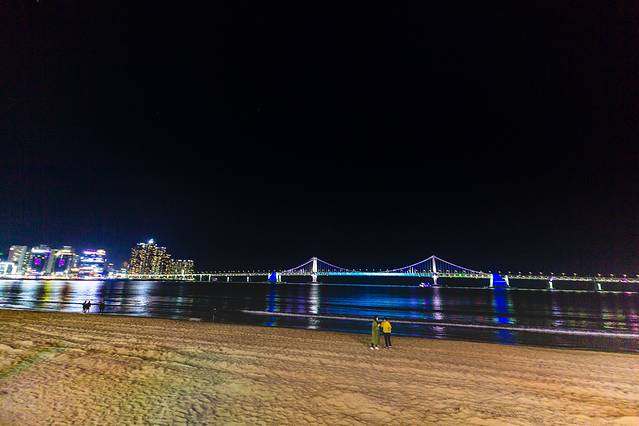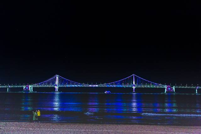 广安大桥具备了全球最大规模的桥梁LED照明灯与音响设备等立体景观照明系统,被誉为“钻石之桥”的广安大桥,在晚上才最能体现它的价值。其实,在釜山城市的各个角度,都能看到广安大桥的身影,但最佳位置,还是非广安里海水浴场莫属,这里从广安大桥正对面的方位,留一晚守候在这里吧,炫美的灯光、激情的灯光秀,你总能收获,你最爱的那一抹夜色。