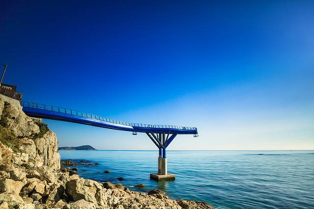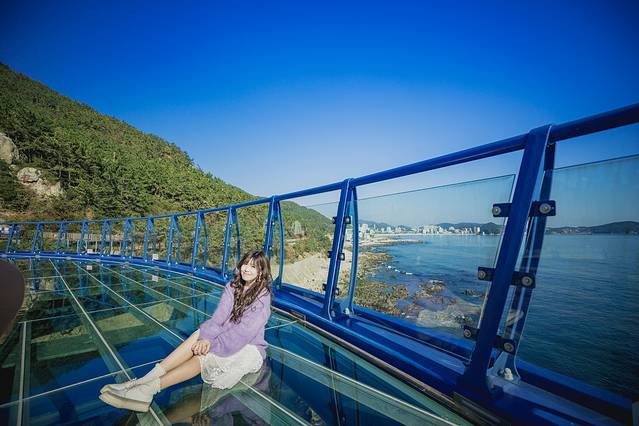 展望台的人行天桥离海水约20米,朝着大海凸出的长度是72.5米,它是蓝天的流线型结构的设计,末端呈半圆形,并在这里设计了透明地板。透过玻璃望向脚下的海面,一片碧蓝,这,大概就是本属于釜山的颜色吧。