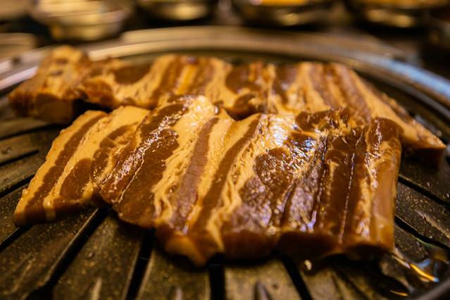 店家招牌烤五花肉,一般的烤五花肉是不会切的这么厚的哦,所以这也是我们选择这家的理由,这样厚切的肉吃起来,外焦里嫩,口感更好。