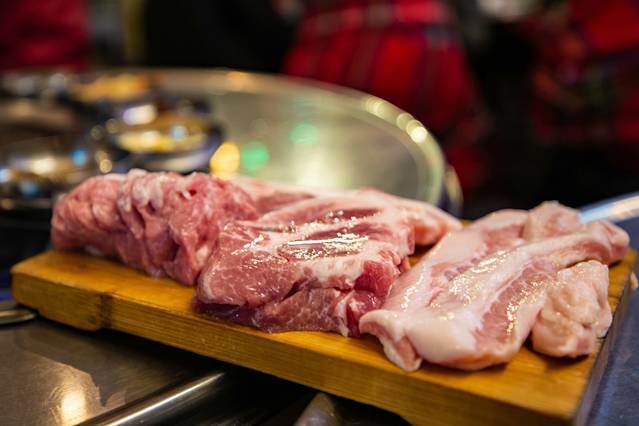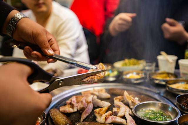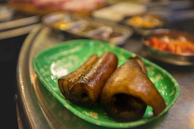 烤猪皮是通过最近大火的韩剧《金秘书为何这样》才走进我们的视线,殊不知,吃烤猪皮一直都是韩国人的传统,来到地道的烤肉店,自然也少不了最地道的才菜式,用两片五花肉夹着一块猪皮的吃法最正点。