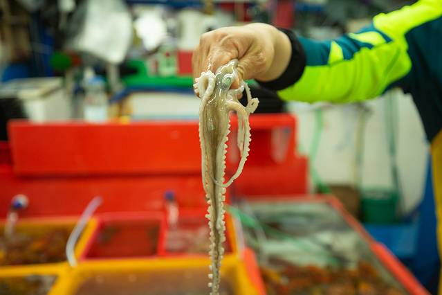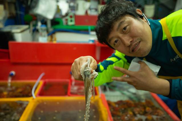 鲜活的章鱼,可爱的店主看到我拍照,还要强势入个镜,他的相貌,很韩国哦~