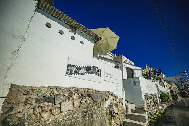 沿着栈道攀到悬崖之上,就是白浅滩文化村了。白色的小房子依次排列,倒是像极了蓝白色的希腊,据说,这里也有“釜山的圣托里尼”的美誉呢。