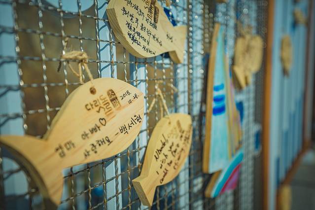 除了大自然的美景,韩国的每一处景观都少不了这些心思细腻的设计,一个个鱼型的祈愿牌,寄托了人们无限美好的愿望与期许。
