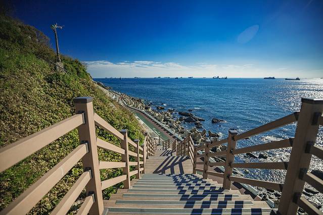 海边的小公路是用橡胶铺就的步道,走在上面软绵绵的,很舒服,而依着悬崖的山势而建的蜿蜒迂回的木质步行梯,从山顶上俯瞰下来,也是极其震撼的。这段步道还有一个专门的名字,叫绝影海岸散步路,这条路从绝影海岸路管理办公室出发途径中里港,最终可达到甘地滨海路和太宗台路。也承载着居民平日里休闲散步的重要职能。