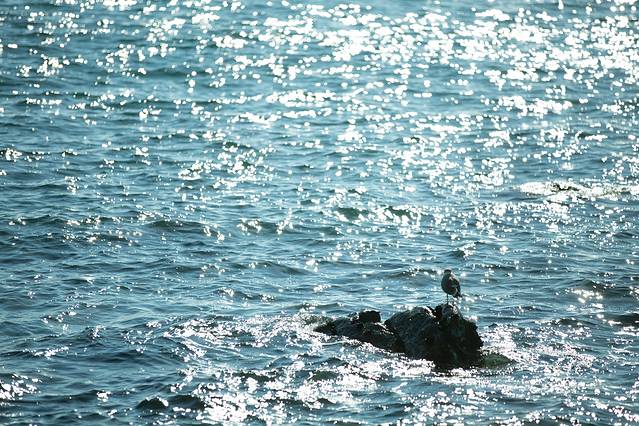 我们来到白浅滩文化村的时候适逢正午,阳光很炽烈的洒在海面上,一只独立于礁石之上的海鸥,就那样淹没在一片波光粼粼中,很美。