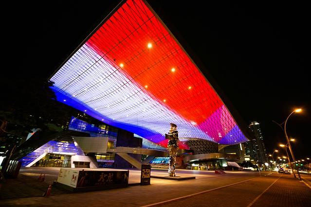 这里就是电影殿堂,拥有号称世界上最大五点的“Big roof”,雄伟壮观。每天的19:00定时有观影灯光秀,建议在这个时间赶过来,霎时间,周围的夜空,也都被它照亮了。