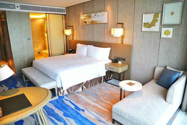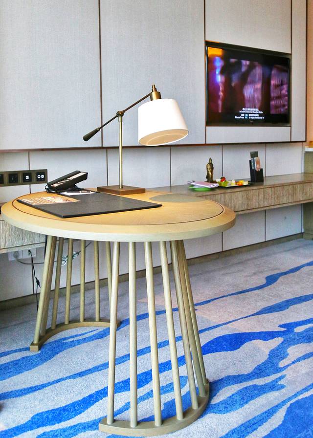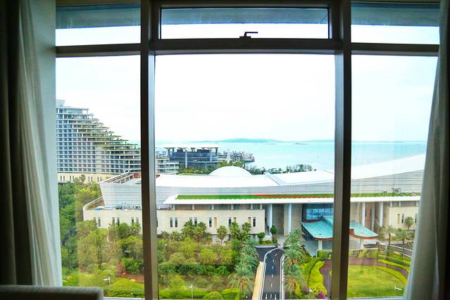 客房宽敞明亮,还可远眺台湾小金门岛,装修走的是现代商务风,地毯是蓝白条纹的海洋状,颇有跟外面蓝天海水相映衬的感觉。贴心的电视柜上还有手写的欢迎贺卡和欢迎小点,惊喜值up!