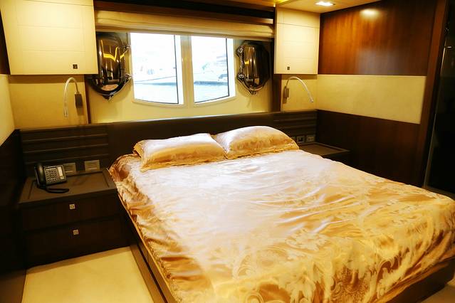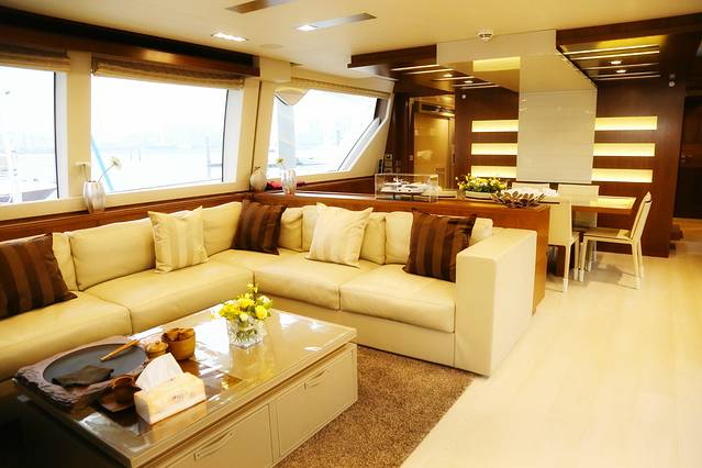主沙龙区设备齐全,纯手工定制的Poltrona Frau家具、全套定制的BOSE影音系统。大型室内开放式沙龙和餐桌,轰趴、桌游、约会统统都可以。游艇有主房及4间VIP客房,全部带独立卫浴、更衣室和海景大窗,相当可以!
