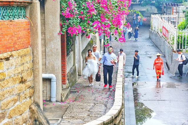 鼓浪屿上随处可见各种欧式旧建筑,比如带小花园的独栋小别墅,颇像广州东山口一带。泉州路的老别墅也是鼓浪屿最集中的一片别墅区,金瓜楼、南瓜楼、宁远楼等都在此处。拍照相当有韵味,自然吸引了不少新人过来拍婚纱照。