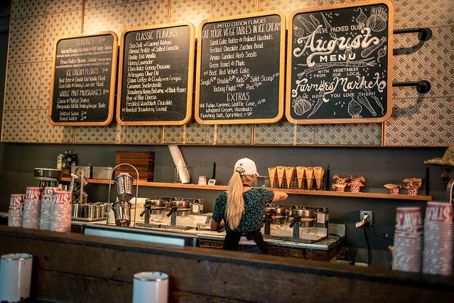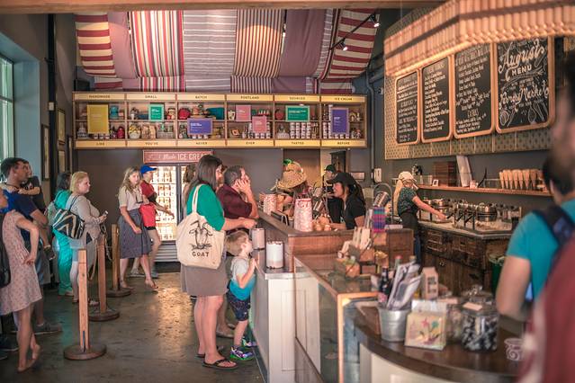 在23街众多店铺中,最有名、最有人气的一家店就是Salt&Straw这家甜品店,我们排了大约15分钟的队才买到。点了里面最具人气的“焦糖 海盐 冰激凌”和“香草奶昔”。