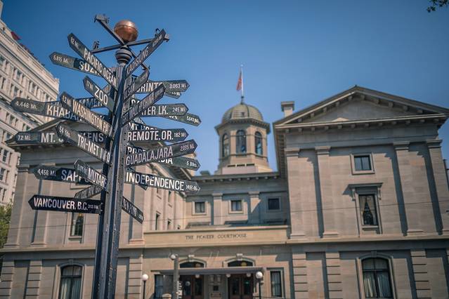 这根路标柱非常的有特色,上面挂了满满一圈的路标,这些标志分别指向 波特兰 在世界各地的姐妹城市以及与它们的距离。在它后面的就是先锋法院了。