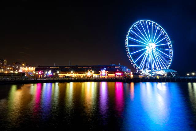 用过餐,夜幕降临,摩天轮的灯也亮了。与傍晚的样子比起来,少了一份惬意却多了一份华丽。
