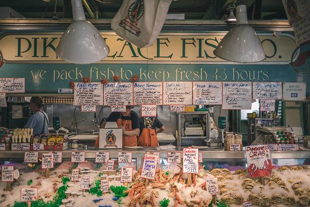 这就是派克市场最著名的“飞鱼秀”摊位,摊位非常好找,围观群众最多的那一家肯定就是了。