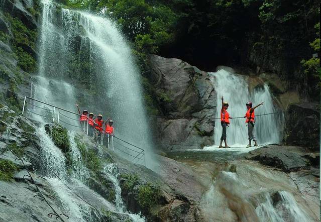 泡完温泉,调休一晚后,我们便来到百丈崖,一入百丈崖,便可见红色字体的标识,于绿树之间掩映。百丈崖景区集青山、绿水、奇石、飞瀑、幽谷于一体,听当地导游说百丈崖还被称为“会动的峡谷”,百丈崖有走钢丝、攀岩、溯溪等参与性项目30余项,碧潭无数,峡谷两旁为原始森林所覆盖。
