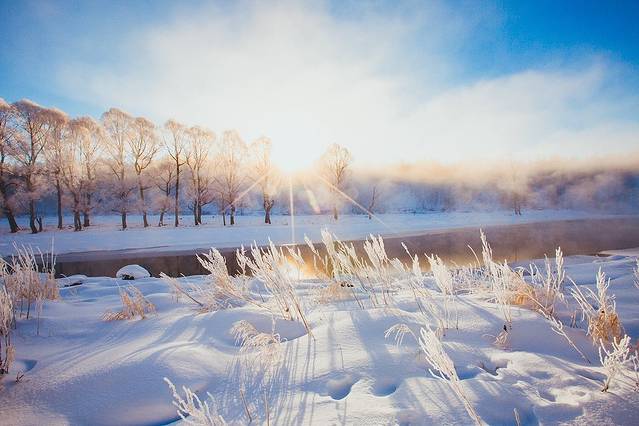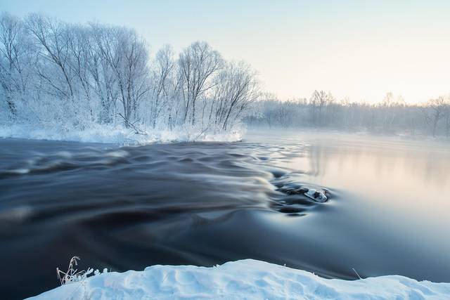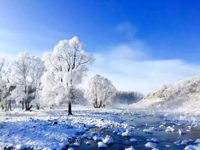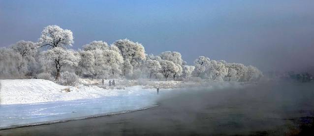 每到寒冬,不冻的江水中升腾的水雾遇冷,在树上凝结为霜花,从远处看正是传说中的玉树琼花,美不胜言。