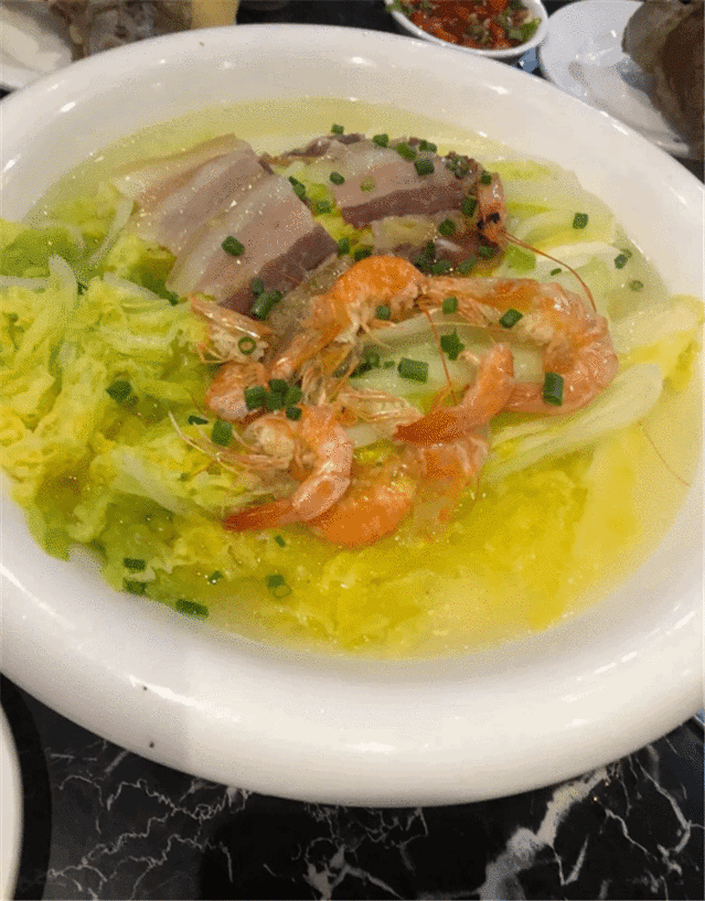 一品娃娃菜的娃娃菜比较大只,咸肉肥瘦适中,香甜可口,不干不湿,恰恰好把握住那种味道。