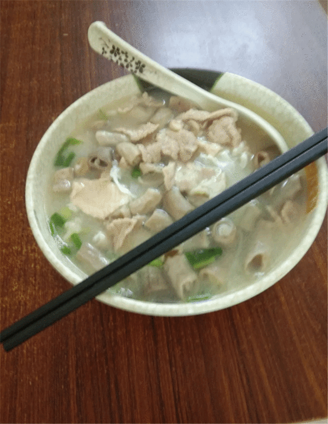 将粉条和葱花,加上一个土鸡蛋,配与猪肚,大肠,小肠等等,再注入滚烫浓香的后安汤。
