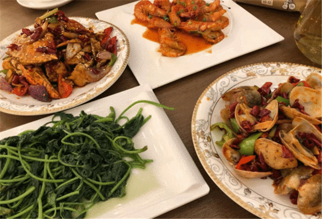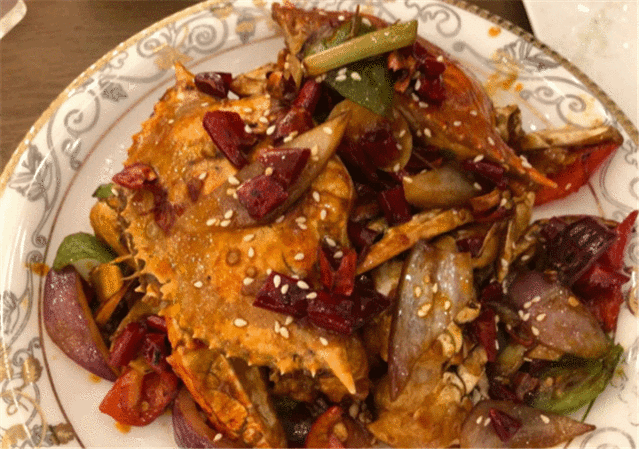 香辣螃蟹,肉质肥美,炒制也非常用心,加入青椒、洋葱、干辣椒等重复提起整道菜的香辣劲儿,爽辣开胃,每一口都恨不得多塞一点进肚子,一口接着下一口,落筷如雨。
