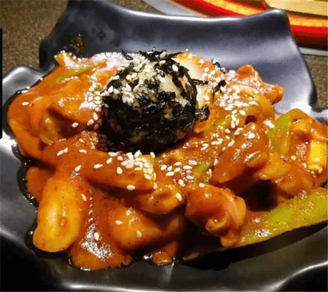 先上的有鸡肉年糕和带着两种酱的蔬菜沙拉,沙拉酱的味道甜甜腻腻的,我很喜欢。