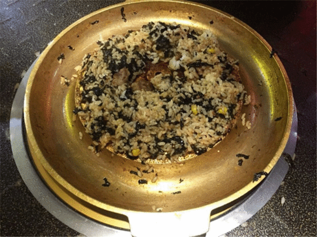 这期间会有服务员忙着码上各种需要烤的肉和菜,最后还把带有蟹子和海苔的米饭拌进底层最精华的酱汁里,烤干后就可以吃了,米粒吸收了之前肉菜的精华,吃起来特别香。