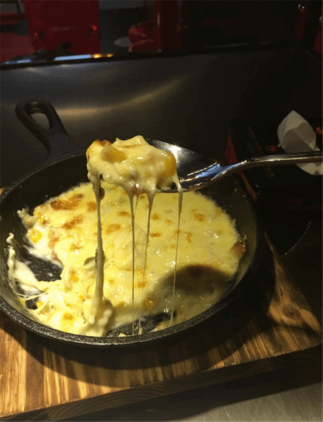 我最喜欢的还是被拉丝芝士包着的玉米粒,玉米粒加上拉丝的芝士很有趣,是适合喜欢甜品的人的,带有奶香的甜味,包着玉米嚼起来感党特别嫩。芝士拯救吃货。