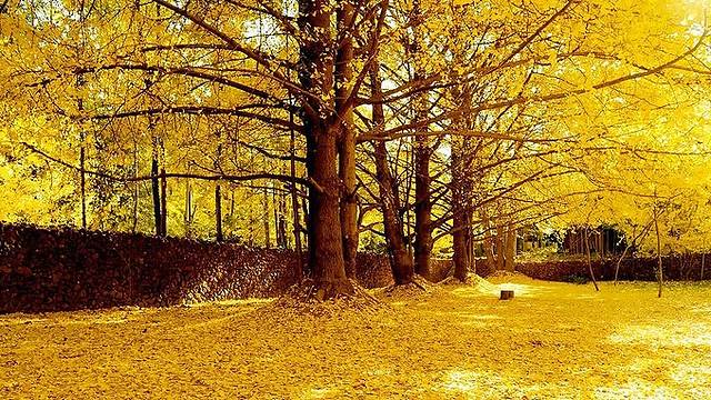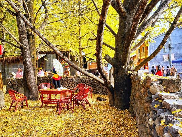 村在林中,林在村中,像一座金色城堡,地面是银杏叶铺就的黄色地毯