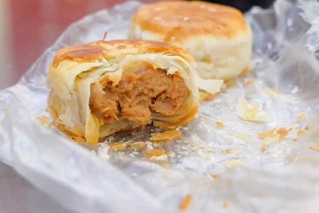 不像广式月饼,如今上海的鲜肉月饼没有时令之分,一年四季都有得卖;但每年中秋前一个多月却卖得最热。馅完全是由一大团鲜肉(猪肉)组成,皮脆而粉,又潜伏着几分韧,丰腴的肉汁慢慢渗透其间,可谓一绝。