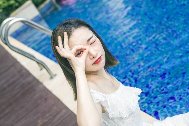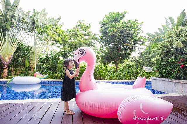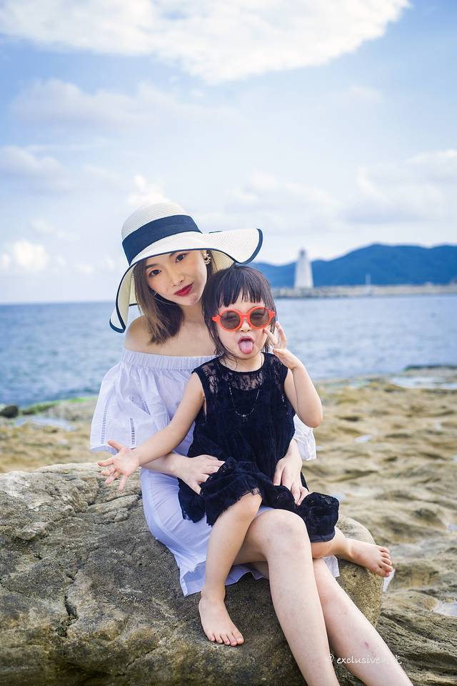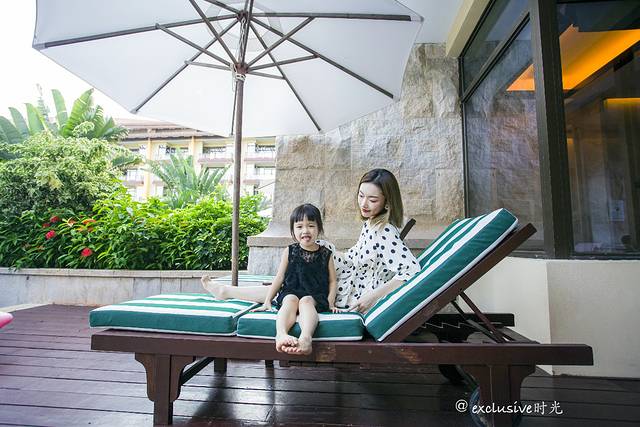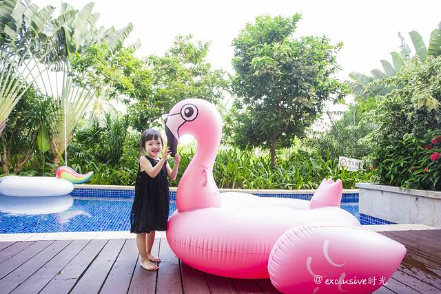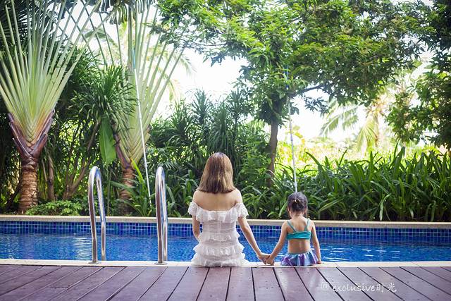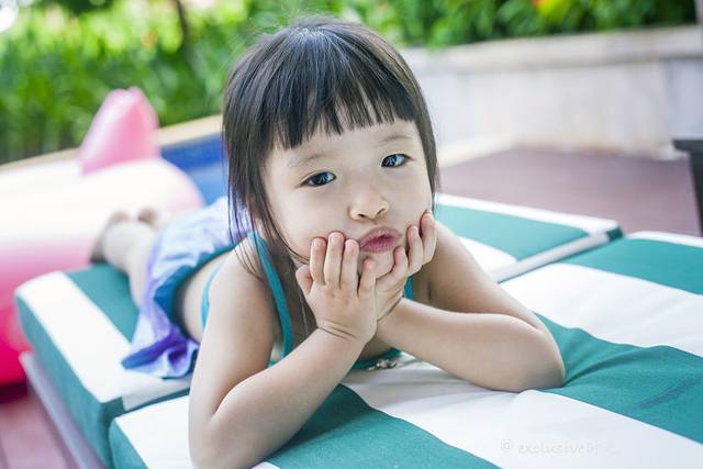 所有取景元素都是在酒店。有游泳池,沙滩,楼下等等。我女儿原本就是个爱拍照的小姑娘,摄影师林斌也很会烘托气氛,团子的表现欲是越来越强。