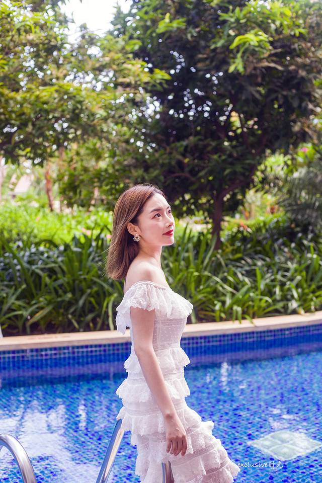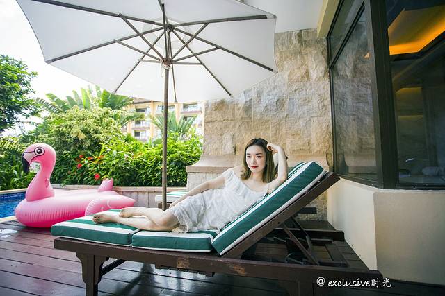 三亚拍照的魔力在于你根本不用刻意找寻景点,一个游泳池,一个躺椅就能拍的很舒服。这主要得益于蓝天白云,以及周围的绿植。