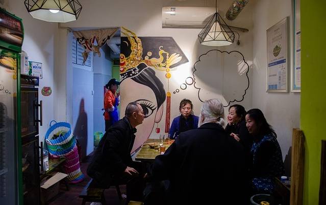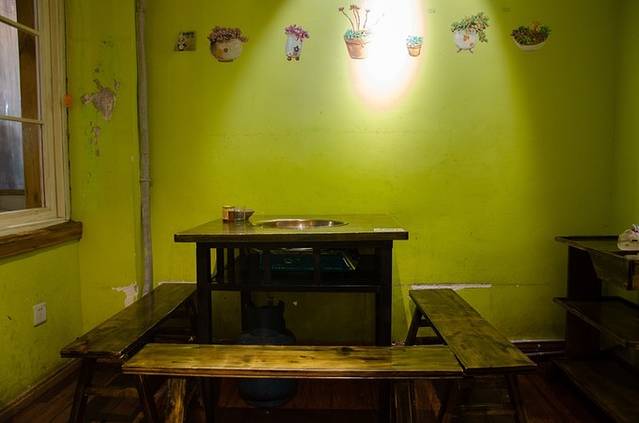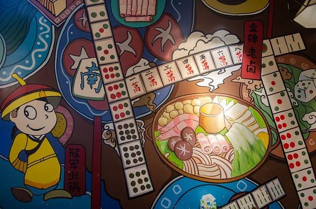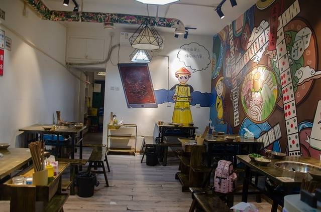 复古的装修风格和原木色的宽板凳,加上墙上卡通彩绘麻将火锅既可爱又喜庆。