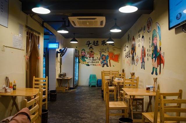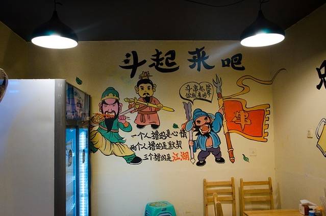 “我不仅卖过草鞋还卖过串串”、“我不读春秋,我撸串”,墙上以桃园三结义为主题的墙绘,很是符合店里的风格,让人感觉趣味满满,别具一格。