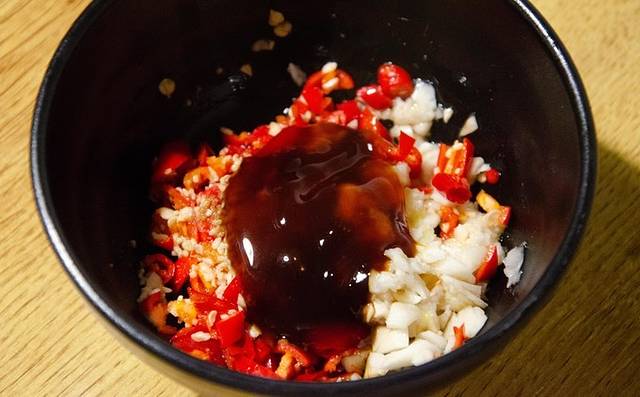 在碗中加入香菜蒜末小米椒,最后倒入符尛尛家的秘制香油,撸起袖手涮火锅了。