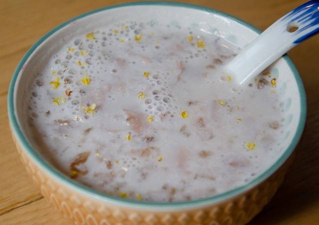 桃胶桂花羹,秋冬季节最适合女孩子的热饮,美容养颜的桃胶加上纯牛奶煮制而成,端上来的时候再撒上一些桂花,清香扑鼻,奶香四溢,既美容又养颜,一碗桂花羹下肚就暖和了。