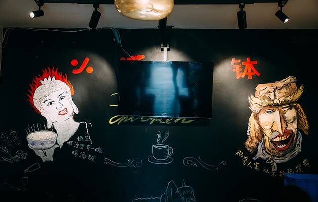 店里的设置装修同样显得别具一格,很有韵味,似乎这也是这条美食街上 所有店铺的基本配置,感觉他们都有相似之处,却又不尽相同,各有特色,电视机墙上的壁画也很有意思。