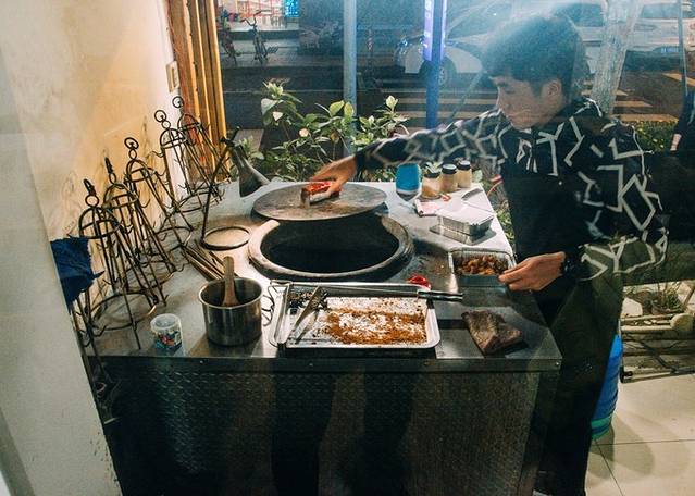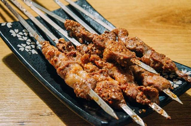 店门口的这个看起来像灶一样的叫“馕坑”,是新疆比较流行的一种烤肉做法,是用坑火的辐射热和坑壁的高温,盖上盖子焖烤而成。 用热量慢慢地焖烤着,让肉串从生到熟都不会直接和明火接触,最重要的一点是由于整体是封闭起来的,相对来说肉质的水分不会过度流失,不仅非常的健康,味道也相当霸道。