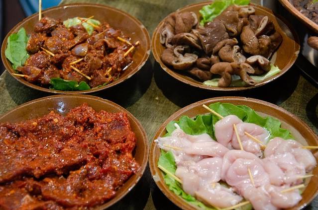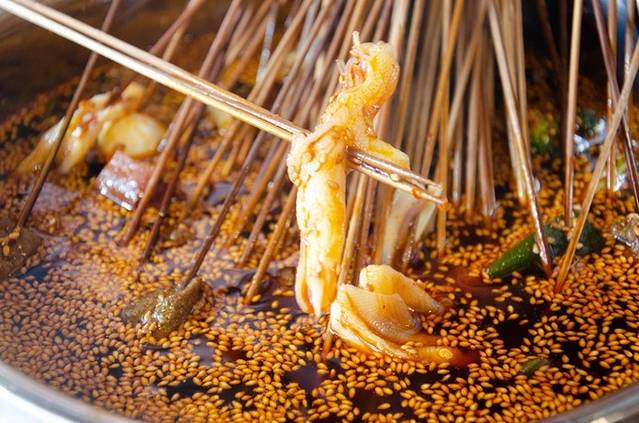 麻辣牛肉,卤制过的鹌鹑蛋和肥肠,鸽子郡肝等等都是经典菜品,先不管那么多细节了,把牙签穿的小郡肝,经煮的卤鹌鹑蛋肥肠了统统下锅还有锅底端上来的时候就已经下锅的鸭血,煮一会儿已经很入味了,鸭血很嫩捞起来沾起香油调料,下嘴的美味根本停不下来。