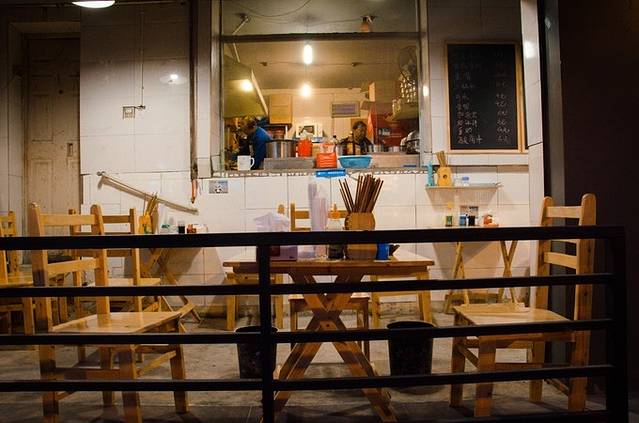 店里都是这样小小的桌子和小小的椅子,因为当天去的比较晚了,去的时候已经有好几桌来吃饭的当地人准备离开了,中间一边吃着串儿,一边和老板家长里短聊着,操着纯正的四川话,一听谈话便知是老顾客了。